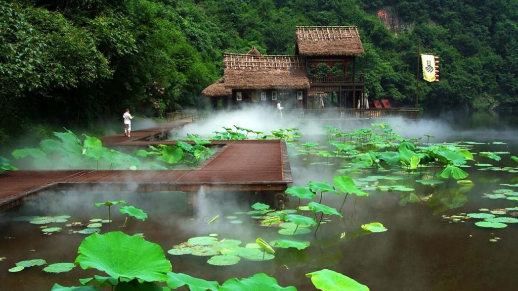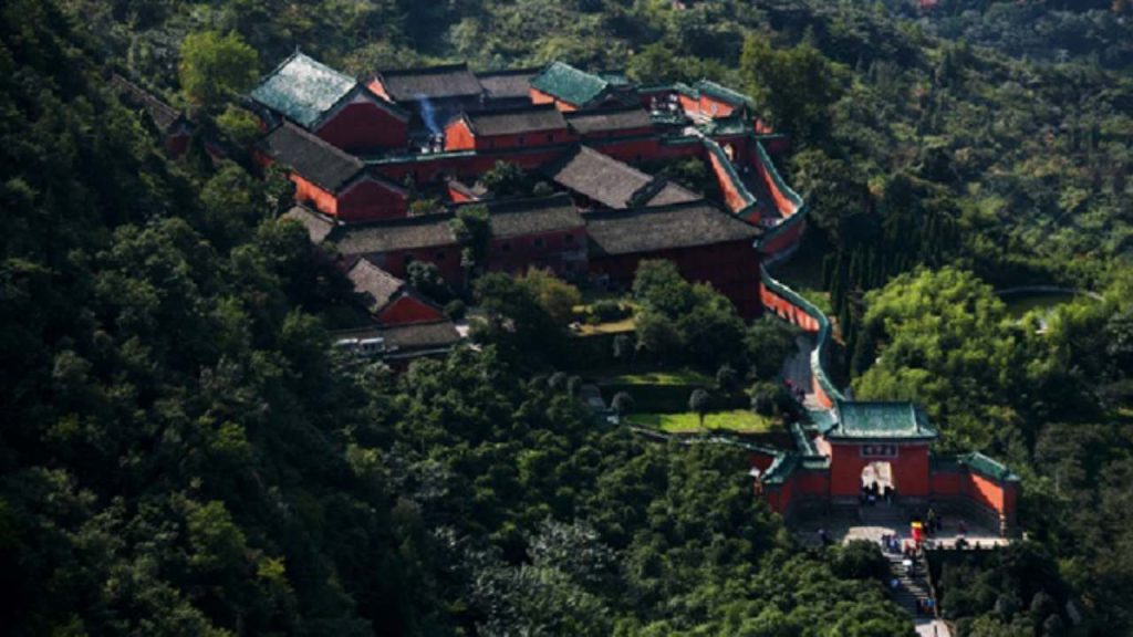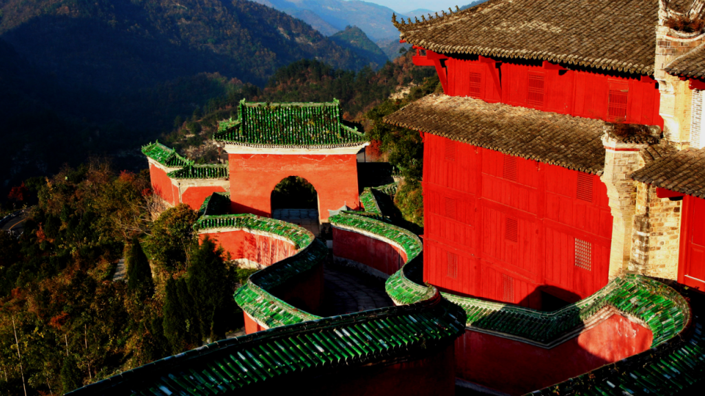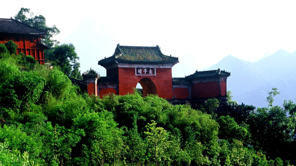 Fuzhen Temple, an ancient architectural complex built on a 60-degree steep slope of Lion Peak on Wudang Mountain, is praised by modern architects as a classic example of architecture utilizing steep terrain. Backed by Lion Mountain, it is flanked by Tianchi Waterfall on the right and the plank road of the Eighteen Bends on the left. From afar, it resembles a lotus emerging from water; up close, it looks like a magnificent fortified city. Ancient architectural masters ingeniously utilized the mountain’s topography, not only creating a site covering 16,000 square meters but also constructing over 200 halls and rooms, forming famous landscapes such as “Four Gates in One Li,” “Nine-Bend Yellow River Wall,” “One Pillar Supporting Twelve Beams,” and “Ten Miles of Osmanthus Fragrance.” The Taizipo Scenic Area includes attractions such as Huilong Temple, Mozhen Well (Chunyang Palace), Laojuntang, and Baxian Temple. The ancient architectural complex of Taizipo was meticulously designed based on the story of Zhenwu’s cultivation. Major scenic spots here include the exquisitely shaped well pavilion of Mozhen Well, “Orthoceras”—a Paleozoic marine invertebrate fossil, and murals depicting “Zhenwu’s Cultivation”; Tianchi Waterfall cascading down a hundred zhang, Dilei Pool, the “One Pillar Supporting Twelve Beams” in Wuyun Building, osmanthus trees, and the Nine-Bend Yellow River Wall at Taizipo; the ancient paths of the Upper and Lower Eighteen Bends fluttering like ribbons, oddly shaped rocks in Jiudu Gorge, and the steep and magnificent Yuxu Rock.